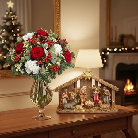 Votre fleuriste à Boulogne-sur-Mer imagine pour vous des compositions uniques. Ce bouquet de Noël capture l’esprit de la Nativité. Il mêle avec élégance des roses rouges passion et des œillets d’un blanc pur. Des branches de sapin frais diffusent un parfum boisé dans votre intérieur. Par ailleurs, des chardons givrés et des baies rouges ajoutent une touche sauvage et authentique.