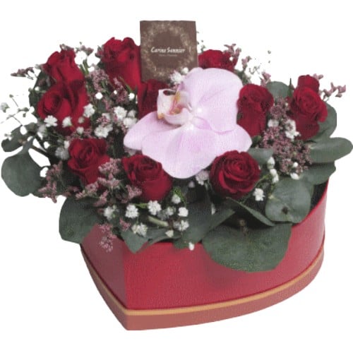 Dans un support de coloris rouge, en forme de cœur, une magnifique composition piquée, réalisée de 10 roses rouges, d’un fleuron de phalaenopsis, limonium, gypsophile et quelques brindilles d’eucalyptus.