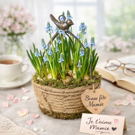 Offrez un cadeau plein de douceur avec cette cage garnie de muscaris, idéale pour célébrer la fête des grands-mères. Grâce à ses fleurs printanières délicates et à sa présentation naturelle, cette composition apporte immédiatement fraîcheur et poésie à la maison. De plus, elle se place facilement sur une table ou un meuble pour créer une ambiance chaleureuse.