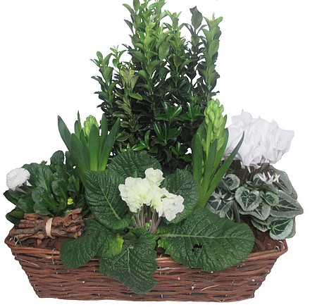 Buis, jacinthes, primevère, paquerette pompon, cyclamen, et petit fagot de bois composent cet ensemble.