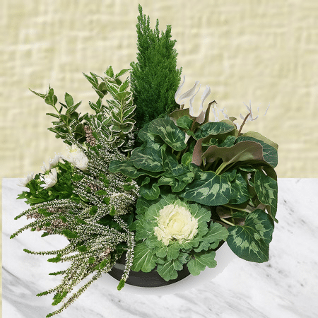 Cette composition florale funéraire allie des espèces symboliques sélectionnées pour leur résistance et leur signification. Elle inclut un cyprès ou conifère symbolisant la vie éternelle, un délicat cyclamen (souvent blanc, évoquant la pureté et la compassion), de la bruyère pour sa robustesse en toute saison et la persistance de l’affection, ainsi qu’un magnifique chou d’ornement pour l’amour inaltérable. Le tout est agrémenté de lierre pour l’attachement et la fidélité.