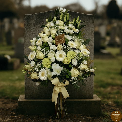 Elle est composée de roses blanches, lys immaculés, germinis, œillets verts, lysianthus et feuillages nobles, harmonieusement assemblés pour offrir un message de paix et de réconfort.