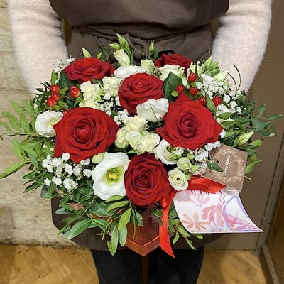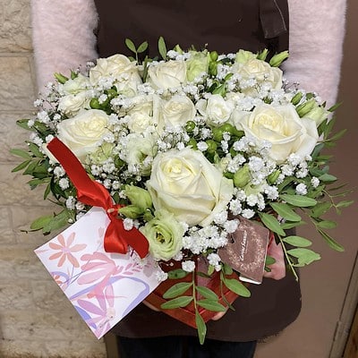 Les fleurs qui composent le cœur, sont travaillées de manière compacte, à majorité de roses.