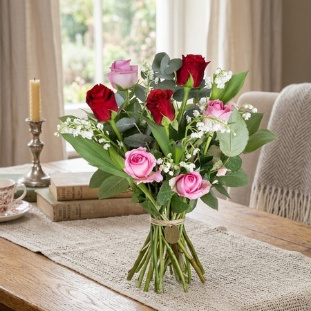 Ce bouquet se compose d’un assemblage équilibré et généreux. Nos artisans fleuristes sélectionnent rigoureusement de somptueuses roses rouge passion pour symboliser l’ardeur. Ils les associent à de délicates roses d’un rose doux et tendre. Pour parfaire la composition, de généreux brins de muguet parfumé s’entremêlent avec grâce.
