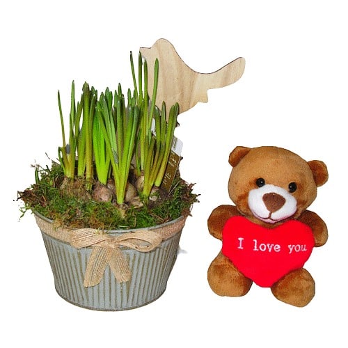 Une potée de muscaris avec ourson (peluche de 15 cm), plante printanière qui annonce les beaux jours.