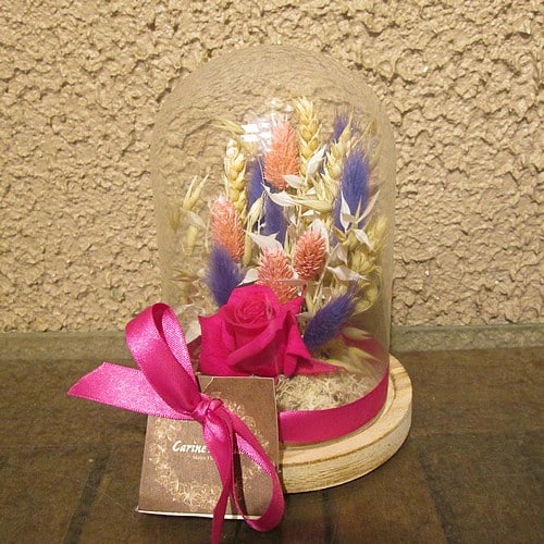 Cloche de diamètre 12 cm pour une hauteur de 16 cm, cette cloche est garnie de fleurs séchées et d’une rose lyophilisée rose fuschia.