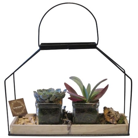 Dans un support composé de bois et de fer reposent deux succulentes dans des verreries,