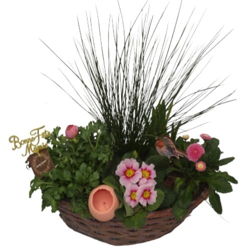Ensemble agrémenté d’un oiseau en bois, d’un poterie, quelques écorces de bois et un pic « Bonne fête Mamie ».