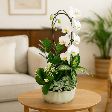 Orchidée phalaenopsis blanc et feuillage décoratif : composition moderne facile d’entretien